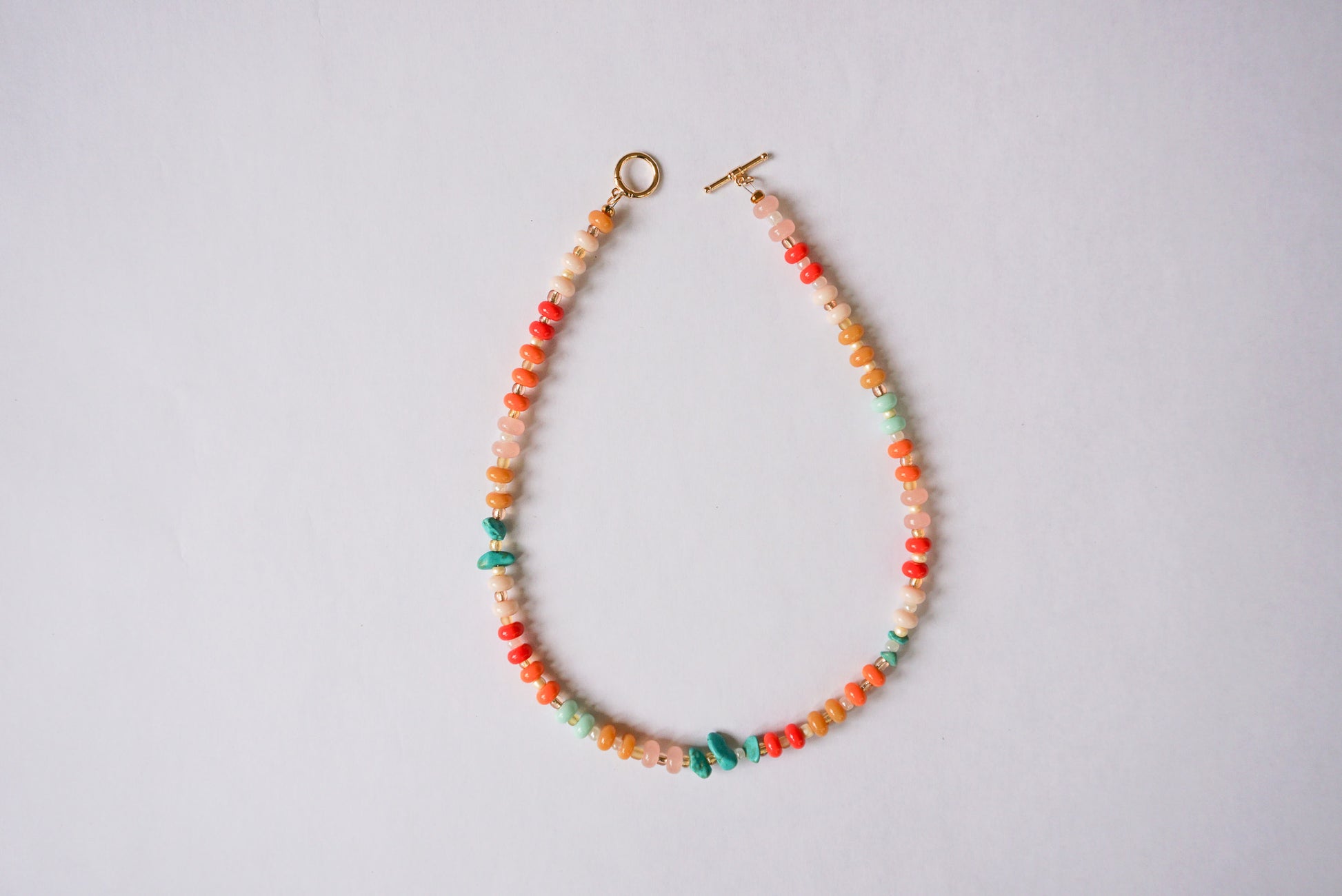 The Nomad Glow Necklace is a radiant blend of colorful glass beads, natural turquoise nuggets, and shimmering gold accents, designed to capture the spirit of movement and adventure. Finished with a gold toggle clasp, this 18-inch piece is bold, joyful, and made to wander.
